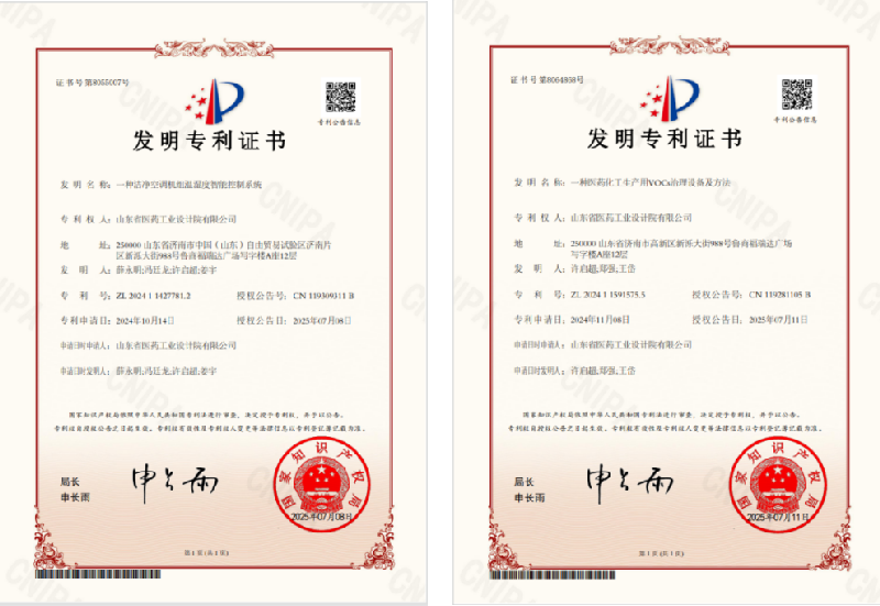 近日,省医工院自主研发的“一种洁净空调机组温湿度智能控制系统”和“一种医药化工生产用VOCs治理设备及方法”获国家发明专利授权,标志着公司在医药工程设计、智能化控制及低碳环保领域取得重要突破。